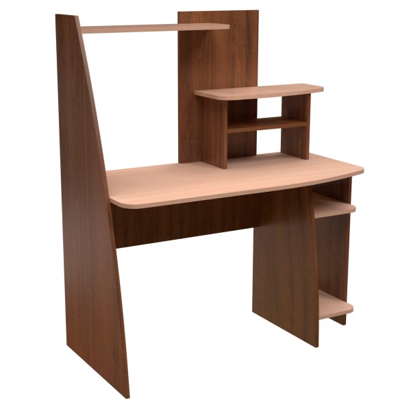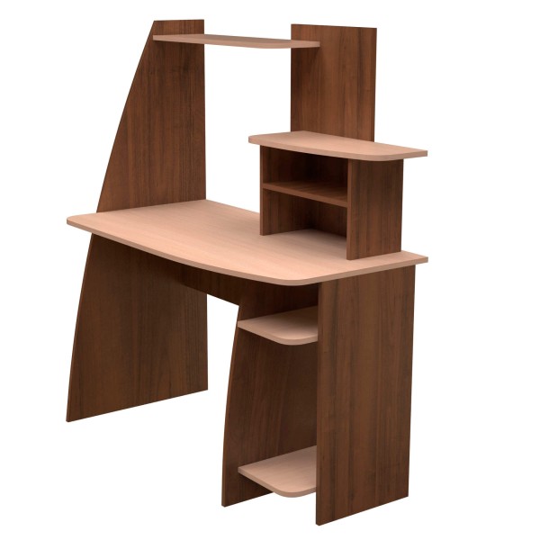 Прямий комп'ютерний стіл з надбудовою. Дизайнерська реалізація поличок у надбудові. Невелика полиця та відсік для системного блоку знаходяться під стільницею. Стільниця злегка закруглена.