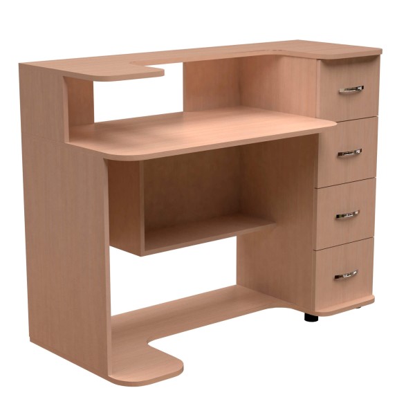 Комп'ютерний стіл на фігурній основі. Прямий, 1200 мм завширшки. Полиця для монітора та колонок повторює форму основи. Між полицею та основою вбудована тумба з чотирьох шухляд. Ширина стільниці - 898 мм. Під стільницею - невелика полиця на рівні колін та відсік для системного блоку. Стіл розміщений на 7-ми ніжках.