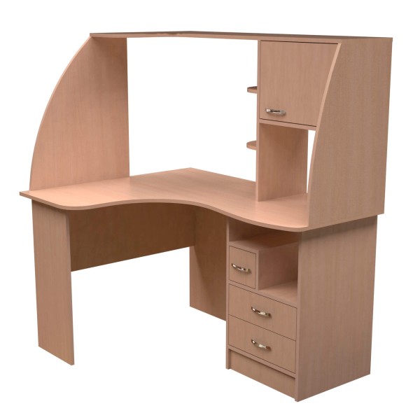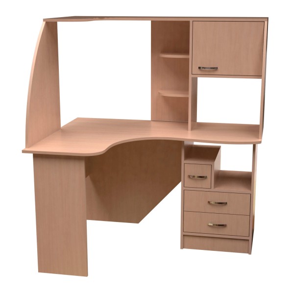 Кутовий стіл з надбудовою, оснащений трьома висувними шухлядами та шафкою. Фігурна полиця знаходиться на висоті столу з надбудовою - 1450 мм. Блок з трьох шухляд знаходиться під стільницею, одна з шухляд має меншу ширину. Шафка та дві кутові полиці розташовані у надбудові.