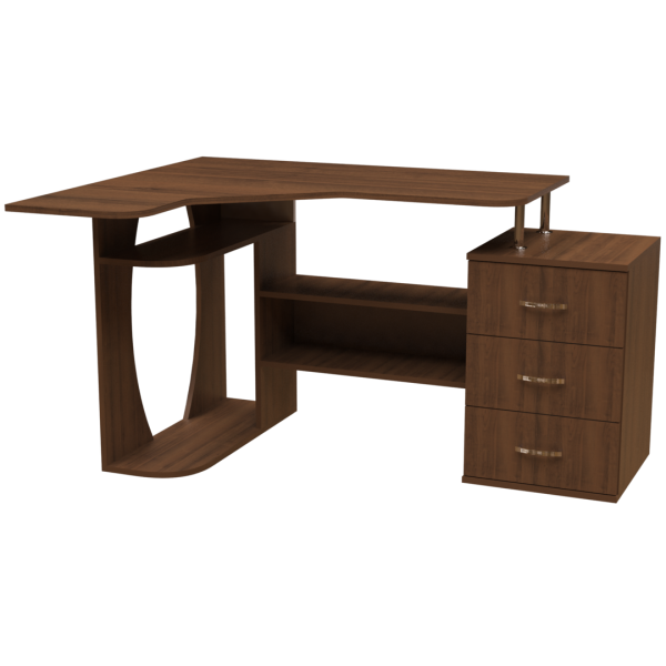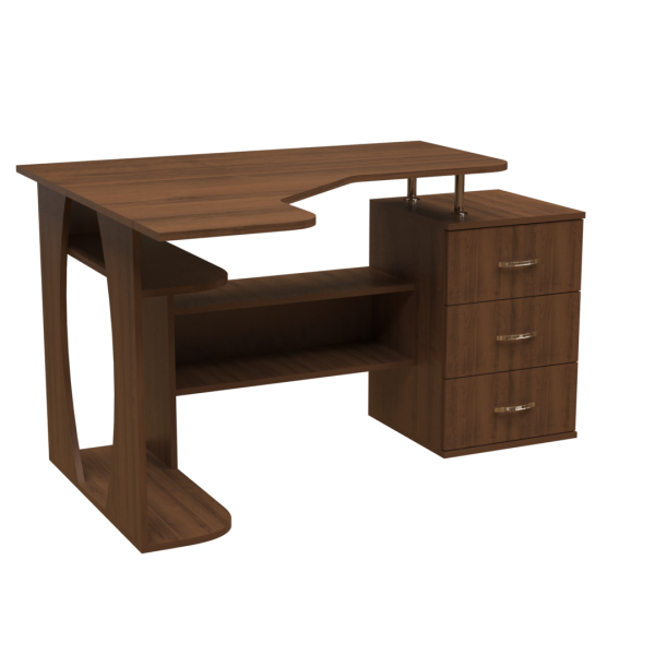 Кутовий комп'ютерний стіл з тумбою та відсіком для системного блоку загальною шириною 1250 мм. Стільниця, 1100 мм завширшки, спирається на тумбу металевими хромованими стійками, тільки частково прикриваючи її. Під стільницею - три полиці. Бокова стінка відсіку для системного блоку має фігурну форму.