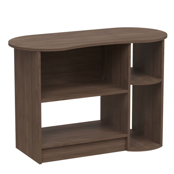 Комп'ютерний стіл з двома секціями полиць. Перша секція представлена у вигляді тумби з двома полицями, одна з яких має задню стінку. Ширина тумби - 620 мм. Друга секція - дві відкриті полиці, одна з яких розташована на підлозі. Ширина полиць - 234 мм. Стільниця стола з закругленими краями та має фігурну форму.