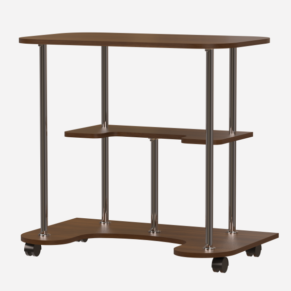 Прямий пересувний комп'ютерний стіл на фігурній основі. Стільниця спирається на основу металевими хромованими стіками. Між стільницею та основою - полиця, яка повторює форму основи, але пропорційно має менший розмір.